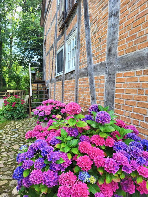 Neben dem Gebäude selbst haben Kerstin und Holger auch einen wunderschönen Garten angelegt. Mit Nebengebäuden und Werkstatt, einer großen Terrasse und einem Hof, der sich zur Dorfstraße hin öffnet. Kein Zaun, keine Abschottung. Trotz der Scharen von Spaziergängerinnen und Spaziergängern, die Fischerhude besonders am Wochenende besuchen. „Wir lieben es, dass hier was los ist und immer wieder nette Gespräche entstehen.“ Deshalb auch die Idee mit der Ferienwohnung. Viele ihrer Gäste sind regelmäßig zu Besuch und zu Freunden geworden.